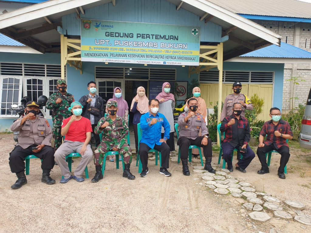 Konsolidasi arahan dan Bimtek TIM TRACER PKM Bukuan di hadiri oleh Dr. Setyo, camat, lurah, Danramil, wakapolsek, Kanit Binmas, babinsa, di Puskesmas Bukuan